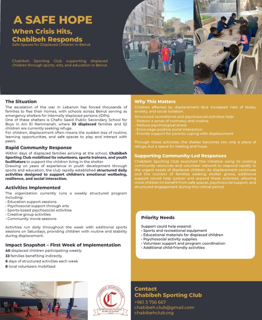 Chabibeh Sporting Club is at the forefront of responding to the ongoing war in Lebanon by creating safe, structured spaces for displaced children in Beirut. Through a combination of sports, arts, and educational activities, the Club provides psychosocial support that restores routine, reduces stress, and fosters resilience among children affected by displacement. Mobilizing local volunteers and leveraging its long-standing expertise in youth development, Chabibeh delivers daily programs that transform emergency shelters into environments of healing, stability, and hope for both children and their families. To follow the activities we are providing, visit our facebook page. (2) Facebook.